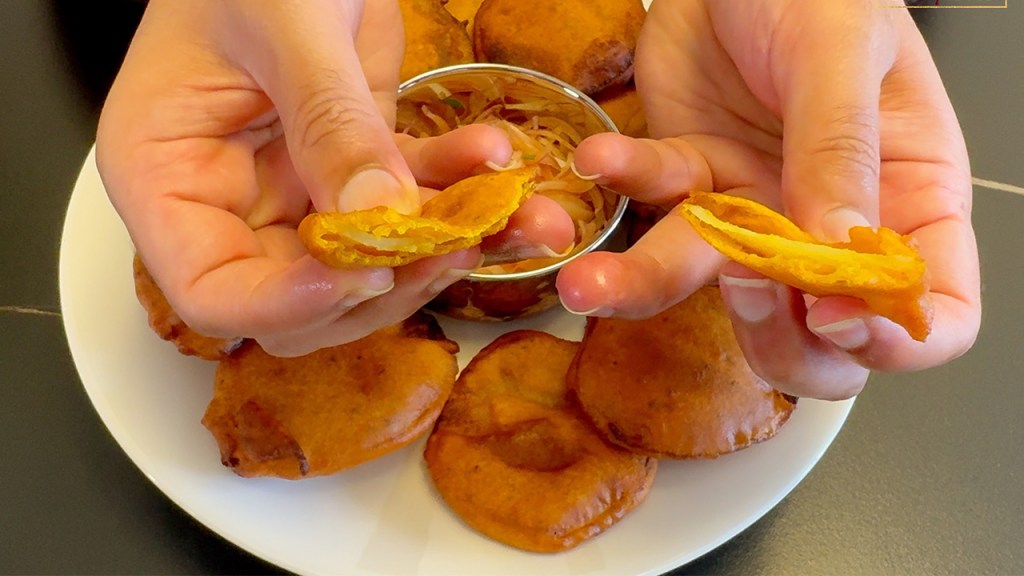 Heat the oil: Pour oil into a kadai (deep frying pan) and heat it over medium flame. To check if the oil is hot enough, drop a small amount of batter into the oil—if it sizzles and rises to the top, the oil is ready.